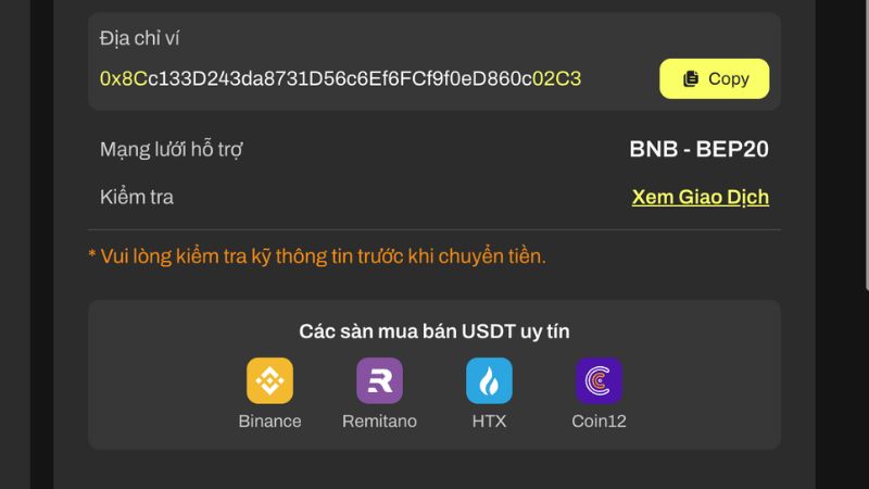 - Hệ thống sẽ tự động hiển thị một địa chỉ duy nhất dành cho giao dịch của bạn, thường là một chuỗi ký tự dài hoặc dưới dạng mã QR code. Bạn phải sao chép chính xác thông tin này.